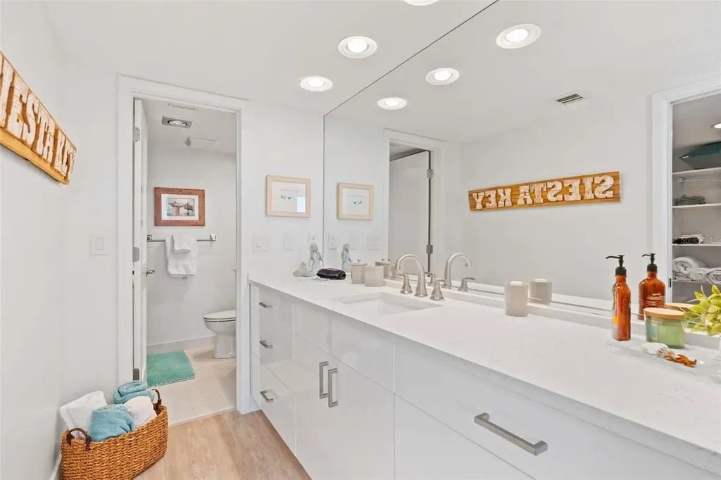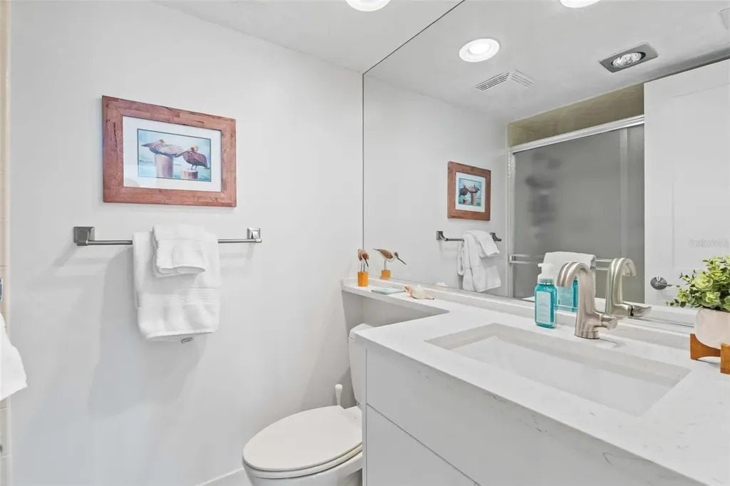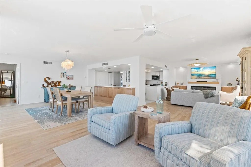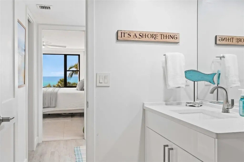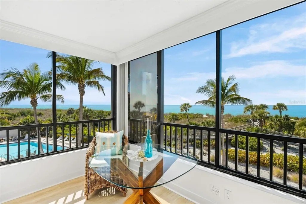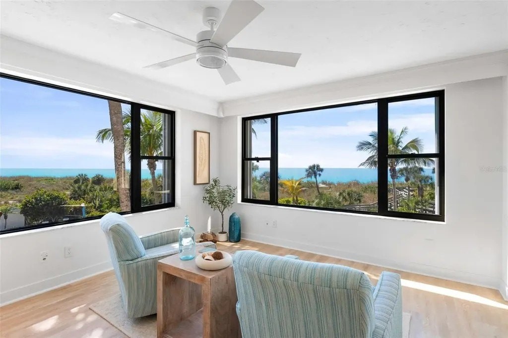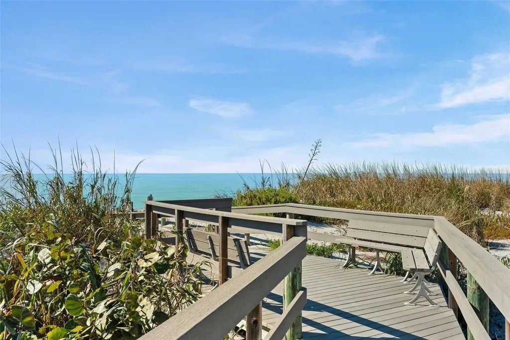 Rarely available at Hidden Lagoon Beach Club, this exceptional turnkey furnished residence offers breathtaking panoramic gulf views from nearly every angle. Wake to the sound of gentle waves, savor the serenity of a secluded beach, and unwind with unforgettable sunset skies - this is coastal living at its finest. Beautifully furnished and thoughtfully renovated, the expansive 2,730-square-foot condo features an expertly redesigned eat-in kitchen and an open-concept floor plan that maximizes both space and natural light. Custom built-in cabinetry frames a striking shiplap accent wall with an inviting electric fireplace, mantel, and TV - perfect for those relaxed evenings. The home includes two generously sized primary suites, each with updated en-suite baths and large walk-in closets equipped with custom organizer systems. Neutral luxury vinyl plank and tile flooring run throughout, creating a clean, coastal elegance. Offered turnkey furnished, excluding personal items, and complemented by an oversized private two-car garage - a rare and valuable bonus. Hidden Lagoon Beach Club is an intimate, gated community of just 24 residences, ideal for those seeking privacy away from the crowds. Amenities include a heated pool with lockers, tennis court, basketball hoop, kayak/canoe launch, tranquil lagoon views, and a charming butterfly garden, along with private gated beach access. Conveniently located just minutes from Siesta Key's renowned dining, shopping, and marinas, this extraordinary home truly offers the best of the best. Schedule your private showing today and experience it for yourself.
